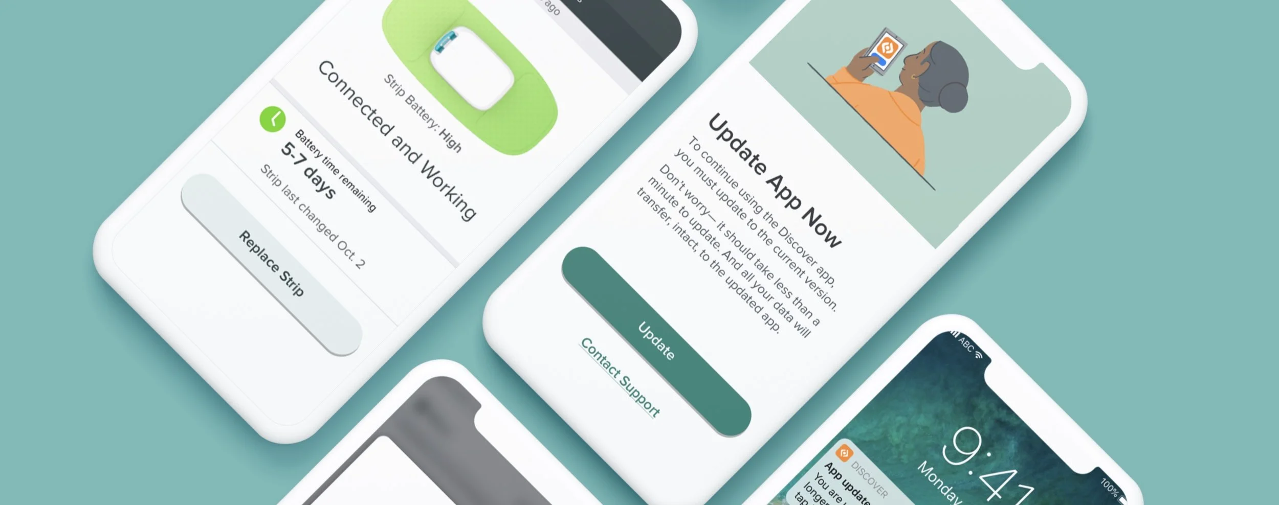 My work was focused on platform features for the Discover appāI collaborated with developers to design a notification system for app updates and explored concepts for an in-app battery indicator aimed at reducing data loss and allowing users to better plan their actions surrounding their wearable patch.